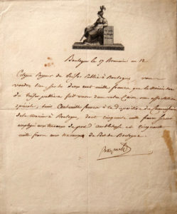 Ordre de paiement pour travaux dans les ports de Boulogne et d'Ambleteuse : « Vous voudrez bien chercher deux cent mille francs que le ministre du Trésor public [François Barbé-Marbois] fait venir dans votre caisse sans affectation spéciale, tenir cent mille francs à la disposition du commissaire de la Marine à Boulogne, dont cinquante mille francs seront employés aux travaux du port d'Ambleteuse et cinquante mille francs aux travaux du port de Boulogne... » Le grand projet de « descente » en Angleterre. À la rupture de la paix d'Amiens, Napoléon Bonaparte se montra fidèle à ses principes privilégiant l'action à la réaction, et il envisagea une opération de grande envergure pour porter la guerre en Angleterre même. Il organisa donc une « armée des Côtes de l'Océan » qu'il massa en trois « camps » sur le littoral faisant face à son principal ennemi : au centre, le « camp de Boulogne et de Saint-Omer », rattaché au port de Boulogne, confié au futur maréchal Soult ; au sud, le « camp de Montreuil », près du port d'Étaples, placé sous l'autorité du futur maréchal Ney ; au nord, le « camp de Bruges », d'abord organisé près de cette ville puis déplacé sous le même nom près du port d'Ambleteuse, et commandé par le futur maréchal Davout – le terme de « camp de Boulogne » désignant dans le langage courant l'ensemble du dispositif. Faute de maîtrise des mers, cette « descente » serait continuellement ajournée, jusqu'à ce que la formation de la troisième coalition (1805) conduise Napoléon Bonaparte, entre temps devenu empereur, à employer ce qu'il renomma « Grande Armée » dans sa campagne contre l'Autriche qui s'acheva victorieusement à Austerlitz. Lettre absente de la Correspondance générale.
