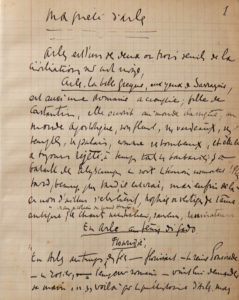 MAURRAS (Charles) — Manuscrit autographe signé d'un essai intitulé « Ma Piété d'Arles ». Riom, 1945. 31 pp. in-4 sur ff. quadrillés de cahier d'écolier, ajouts et corrections (notamment une longue citation de Mistral sup