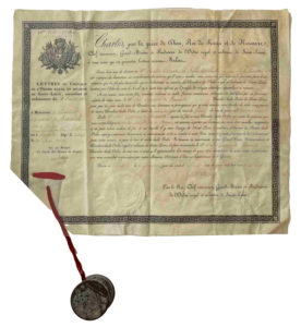 Charles X. Acte signé « Charles » (griffe) contresigné par le vicomte de Caux, ministre secrétaire d'État de la Guerre. 1828. Lettres patentes de chevalier de Saint-Louis octroyées au chevalier Cyresme de Banville. Document complet du sceau sous papier et du sceau de cire rouge sous boîte métallique. — Etc.