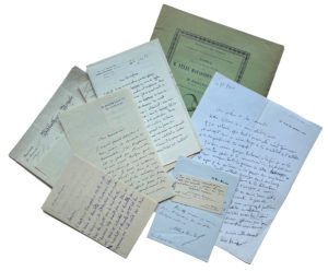 Aubry (Octave). 2 lettres autographes signées. « ... J'ai toujours été si gâté par Bruxelles et mes amis belges que, chez vous, je me sens chez moi. Je suis d'ailleurs du Nord, et bien de nos goûts sont les mêmes... » (1936) et félicitation pour la Légion d'honneur (1938). — Champion (Pierre). 3 lettres. Soit : une lettre signée avec 5 lignes autographes, adressée à l'archiviste Armand Boutillier Du Retail, concernant l'achat par celui-ci de l'inventaire sommaire des archives communales du département de l'Aube (1913) ; une lettre autographe signée à Sacha Guitry à qui il envoie les épreuves de son livre Marcel Schwob et son temps (1926) ; et une lettre autographe signée à un « cher Monsieur », concernant un ouvrage annoté de la main de Jean Dorat et de Pierre de Ronsard (1924). — Champollion-Figeac (Jacques-Joseph). Lettre autographe signée. 1839. Au sujet de Guillaume-Stanislas Trébutien, orientaliste, historien, philologue, libraire-éditeur et bibliothécaire, ami de Jules Barbey d'Aurevilly. — Chastenet (Jacques). Lettre autographe signée à René Dumesnil, en remerciements de l'envoi d'un exemplaire de l'édition que celui-ci a publiée de L'Éducation sentimentale de Gustave Flaubert (1943). — Compigny Des Bordes de Villiers de L'Isle-Adam (Antoine de). 2 lettres autographes signées, 2 lettres signées, et une carte de visite autographe signée. 1924-1925 et s.d. Joint, 5 prospectus de ses ouvrages. — Funck-Brentano (Frantz). 4 lettres (3 autographes signées et une signée). 1934-1938. Concernant Les Souvenirs de la comtesse de Caylus. — Hanotaux (Gabriel). Lettre autographe signée. 1938. Concernant entre autres les Mémoires de mademoiselle d'Aumale et de madame de Caylus. — Lalanne (Ludovic). Lettre autographe signée. 1894. Concernant l'impression d'un bulletin. — Masson (Frédéric). Lettre autographe signée. 1921. Sur la visite des membres de l'Académie belge de langue et de littérature française à Chantilly, à l'invitation de l'Académie française. — Lévis-Mirepoix (Antoine de). Lettre autographe signée à un « cher confrère et cher camarade ». « ... J'ai bien connu Georges Duhamel... » (1967). — Lichtenberger (Henri). 6 lettres et cartes autographes signées du germaniste et traducteur de Friedrich Nietzsche au germaniste et philosophe Jean Bourdeau, concernant la correspondance échangée entre Friedrich Nietzsche et Hippolyte Taine (vers 1900). Joint, une lettre autographe signée de la veuve d'Hippolyte Taine, sur le même sujet (1900). — Porcher (Jean). Lettre autographe signée en qualité de directeur du département des Manuscrits à la Bibliothèque nationale. 1932. Concernant la préparation d'une exposition sur Rabelais, pour laquelle il recherche des faïences à sujets gargantuesques et une toile de Jouy représentant Panurge dans l'île des Lanternes. — Prou (Maurice). 2 lettres autographes signées du paléographe. Au sujet du déchiffrement d'une lettre cryptée adressée au duc de Lorraine (1895) et concernant un portrait de lui publié dans L'Impartial (1927). Joint, la lettre d'un chartiste concernant la paléographie (1895). — Rastoul (Amand). Plaquette imprimée intitulée « Émile Laloy ». Nogent-le-Rotrou, imprimerie Daupeley-Gouverneur, 1938. Tiré à part de la Bibliothèque de l'École des chartes, t. xcix, 1938. In-8, 3 pp., brochée. Envoi autographe signé. — Vandal (Albert). Lettre autographe signée et carte de visite autographe. — Joint : Bergson (Henri). Notice sur la vie et les œuvre de M. Félix Ravaisson-Mollien. Paris, Institut de France (typographie de Firmin-Didot et Cie), 1904. Intéressante étude sur ce philosophe et archéologue.