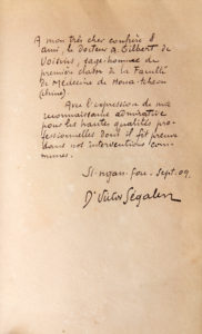 Édition hors commerce à usage privé, tirée à 50 exemplaires sur vélin à la forme justifiés et signés par l'auteur de son monogramme ; seul grand papier. Extension du domaine de la bibliophilie. Il s'agit là de la thèse pour le doctorat de médecine que Victor Segalen soutint à Bordeaux en janvier 1902, et dont il donna 2 éditions hors commerce concomitantes : l'une, à usage universitaire, fut tirée à très petit nombre sous le titre explicite L'Observation médicale chez les écrivains naturalistes, et l'autre, à usage privé, comprit un tirage de tête restreint à 50 exemplaires sur grand papier, destinés aux amis et personnalités du monde littéraire. Joris-Karl Huysmans, qui fut le destinataire d'un de ces exemplaires s'exclama dans sa lettre de remerciements du 16 février 1902 : « Quel révolutionnaire vous faites, vous introduisez l'impression de luxe dans la thèse ! » Médecine littéraire et littérature médicale. Écrit dans un style très littéraire, ce travail universitaire étudie précisément le cas médical du « document humain » dans la question plus large des prétentions scientifiques de la littérature naturaliste. Partant de la préface que les frères Goncourt ont publiée à ce sujet en tête de Germinie Lacerteux, il se propose de mettre leurs idées à l'épreuve dans son propre domaine d'expertise : « Puisque [...] la technique de toute une école littéraire s'est réclamée des "libertés et des franchises" de la science, et en particulier des droits du médecin, il n'est pas déplacé à la science médicale d'apprécier la mesure dans laquelle cette école a tenu ses promesses, compris ses devoirs professionnels, conduit ses investigations cliniques, justifié, enfin, les droits arrogés » (préface). Pour cela, il entend « détailler les différents modes d'observation technique par lesquels un littérateur soucieux du vrai et désireux de science scrupuleuse, pouvait en acquérir les exactes notions ». Il examine par exemple comment Émile Zola a traité l'alcoolisme chronique de Louis Copeau dans L'Assommoir, ou comment l'« hystéro-neurasthénie » de Jean Des Esseintes a été décrite dans À Rebours par Joris-Karl Huysmans. Ce dernier, qui sort d'ailleurs indemne de la l'examen critique de Victor Segalen, lui écrivit le 16 février 1902 : « [...] Vous avez mis un peu d'ordre dans une question totalement inconnue et ingénieusement mis en valeur les quelques renseignements techniques et observations précises que les uns et les autres, nous avions pu, au cours de nos bouquins, trouver ; mais je ne puis me figurer sans sourire la tête des vieux bonzes de la médecine lisant votre thèse. Ce qu'ils ont dû être ahuris et se demander comment vous aviez pu avoir l'idée d'aborder un tel sujet hors de leur portée ! » Envoi autographe signé, en Chine : « À mon très cher confrère & ami, le docteur A. Gilbert de Voisins, sage-homme de première classe de la Faculté de Médecine de Houa-Tchéou (Chine). Avec l'expression de ma reconnaissance admirative pour les hautes qualités professionnelles dont il fit preuve dans nos interventions communes. Si-Ngan-Fou. Sept. 09... » Victor Segalen fait ici une allusion plaisante à une péripétie de son voyage en Chine avec Augusto Gilbert de Voisins : après une discussion sur l'obstétrique en fumant l'opium à Houa-Tchéou (Huazhou), près de Si-Ngan-Fou (Xi'an) dans le Shanxi, il fut appelé en pleine nuit à aider une femme chinoise à accoucher, et fut aidé en cela par son ami Augusto. Écrivain voyageur original, Augusto Gilbert de Voisins (1877-1939) était le petit-fils de Marie Taglioni, et avait épousé la fille de José-Maria de Heredia, Louise, divorcée d'avec Pierre Louÿs. Il accompagna deux fois Segalen en Chine, en 1909 et en 1914, finançant les voyages grâce à sa grande fortune, participant aux recherches archéologiques de Victor Segalen et partageant ses intérêts littéraires. L'exemplaire de Stèles qu'il reçut en 1912 souligne leur proximité : « Pour toi, mon cher Augusto, – qui eus mérité une haute stèle d'amitié sur les routes de terre jaune, – ces étapes d'un autre voyage où tu ne m'as pas quitté d'un pas. » Le « cher Augusto », évoqua ses relations avec Victor Segalen et la naissance des livres chinois de celui-ci dans le chapitre « Le souvenir de Victor Segalen » de son livre Écrits de Chine (Paris, Crès, 1923) : « Mais comment l'avais-je d'abord connu, ce compagnon de qualité si rare ? quel hasard amena, au juste, l'invention de notre premier projet et quels furent les résultats de la randonnée entreprise ? Ces pages vouées au souvenir de mon ami l'expliqueront un peu. [...]. Un soir que nous nous entretenions du plaisir que l'on prend à courir le monde et que, dessinant des itinéraires supposés, nous tâchions de savoir si Bornéo, Célèbes ou les îles environnantes promettent plus à l'utopiste que la Chine occidentale ou la Birmanie, une question se posa, très inattendue bien que toute simple, déjà ravissante et qui nous émut l'un et l'autre : ce voyage, une fois défini, ce voyage qui réunirait en lui seul toutes les vertus de la longue randonnée par ce qu'il contiendrait de rêve et de réel, ce voyage dont la saveur naissait sur nos lèvres, pourquoi ne pas le tenter ? Et aussitôt le plan de la discussion fut changé. Il ne s'agissait plus d'imaginer, il fallait choisir [...]. L'Asie continentale nous appelait d'une voix forte, la Chine surtout, la Chine peu fréquentée : les plaines de lœss, le Kan-Sou glacé, le Sseu-tch'ouan par lequel on monte vers le Thibet, les grands fleuves, enfin, dans leur haut cours, et ces autres contrées luxuriantes et lourdes qui mènent aux tropiques [...]. Quelques mois plus tard, nous nous retrouvions à Pékin. De juillet en avril de ces deux années heureuses [1909-1910], que de beaux jours brûlants ou froids, bleus ou gris, immobiles et tourmentés ! [...]. 