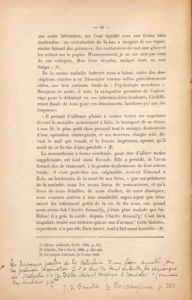 Édition originale. « Exemplaire revu » (mention autographe au crayon bleu sur la première page de couverture), pour une réédition abandonnée : il comprend des notes autographes, dont une sur collette, et des coupures de presse datées de 1902 à 1906 également annotées et collées dans le volume (sauf deux jointes). Ces coupures sont des articles ou passages d'articles extraits principalement de La Chronique médicale et de la Revue de Paris, et viennent enrichir le propos initial, sur des points ou des auteurs particuliers : Alexandre Dumas père, Émile Zola, la formation médicale d'Hippolyte Taine, une scène médicale du Capitaine Fracasse de Théophile Gautier critiquée par Ernest Feydeau. Les notes parsemant le volume concernent la nouvelle « Le Manuscrit d'un médecin de village » publié par Anatole France dans L'Étui de nacre (pp. 22-23), des lettres de Gustave Flaubert à sa nièce (p. 34), les ouvrages de Friedrich Nietzsche Humain, trop humain (p. 44) et Le Cas Wagner (« ... Wagner est un névrosé... », sur collette p. 41), Le Capitaine Fracasse de Théophile Gautier (p. 19), un poème de L'Âme nue d'Edmond Haraucourt (p. 44) ou une citation du traité Le Bovarysme de Jules de Gaultier (pp. 45-46). Pour nuancer ce passage des Cliniciens ès-lettres : « Car la douleur – surtout mentale – est aiguisante et féconde, elle affine le cerveau qu'elle épreint, l'évade pour un instant de sa médiocrité », Victor Segalen cite en marge, de sa main, le célèbre « Cahier pour Aline » de Paul Gauguin qu'il avait pu consulter chez leur ami commun Georges-Daniel de Monfreid : « ... Il est vrai que [par contre] la souffrance vous aiguise le génie. Il n'en faut pas trop, cependant, sinon elle vous tue." » (p. 43). Cet exemplaire a figuré dans l'exposition De Tahiti au Thibet ou les Escales et le butin du poète Victor Segalen, tenue à la librairie Jean Loize en 1944 (n° 11 du catalogue imprimé).