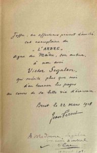 Première édition collective, en partie originale, comprenant notamment la première parution de trois textes : L'Échange, Le repos du septième jour, La jeune fille Violaine, et la réédition de deux autres dans de nouvelles versions : Tête d'Or et La Ville. Un des 15 exemplaires numérotés sur hollande, seul grand papier. Ex-dono autographe signé de Jean Fernet à Victor Segalen : « J'offre, en affectueux présent d'amitié, cet exemplaire de "L'Arbre" digne du Maître, son auteur, à mon ami Victor Segalen, qui mérite plus que moi d'en tourner les pages au cours de sa belle vie d'écrivain... Brest, le 22 mars 1918. » Victor Segalen a évoqué le présent exemplaire dans deux lettres, l'une à Paul Claudel, le 25 janvier 1915 : « Je reprends L'Arbre, dans un hollande vêtu d'un beau maroquin plein que m'a prêté le seul ami d'intelligence que me livre Brest en ces temps-ci, Jean Fernet, lieutenant de vaisseau », et quatre jours plus tard à son ami Jean Lartigue : « Inévitablement repris du Claudel, et le plus claudélien : Tête d'or, dans l'édition sur hollande du recueil "L'Arbre", prêté par le délicat Fernet, lieutenant de vaisseau à bord du six-cheminées Jeanne-d'Arc. Trouvé dans Tête d'or, un puissant passage d'une actualité toute gueulante : le récit du messager, au IIe acte, peignant la marche d'une armée ennemie en colonnes profondes, la bataille, la victoire, et le cœur au ventre remis en chacun par Tête d'or. Tel le terrien gamin inventant la vraie mer marine dans "Bateau ivre", Claudel, dans la paix sociale et confite du symbolisme finissant a posé là une formidable impression que nous pouvons deviner en trayant le lait sanglant de ces derniers mois. – Deux grands voyants, l'un et l'autre. » À la demande de l'épouse de Victor Segalen, Yvonne, Paul Claudel a ajouté un envoi autographe signé : « À Madame Segalen. Souvenir amical... 11 août 1921. » Sur les rapports de Victor Segalen avec Paul Claudel, cf. supra le n° 87. Joint, une vue photographique du buste de Paul Claudel par Camille Claudel (tirage ancien).