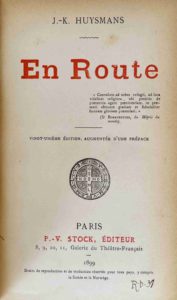 – En Route. Paris, P.-V. Stock, 1899. In-18, xi-(1 blanche)-458 [chiffrées 3 à 458 sans manque] pp., couverture supérieure conservée. Ouvrage originellement paru chez le même éditeur en 1895. Victor Segalen évoqua les « mystiques attirances des premières pages de En Route », dans une lettre du 8 mai 1899 à l'écrivain et historien Émile Magne. – À Rebours. Paris, Bibliothèque-Charpentier, Eugène Fasquelle, 1899. In-12, (4 dont la dernière blanche)-294-(2 blanches) pp. Victor Segalen travailla entre autres sur cet ouvrage pour écrire sa thèse de médecine soutenue en 1902, dont il adressa un exemplaire de luxe à Joris-Karl Huysmans, lequel l'en remercia et l'en félicita. Volumes de la bibliothèque de Victor Segalen : signature sur le faux-titre d'À Rebours, mentions autographes « R-b-32 » sur le titre d'À Rebours et « R-b-31 » sur la couverture d'En Route (sans doute des cotes de sa bibliothèque personnelle d'alors), avec ex-libris dorés en queue de dos. Joris-Karl Huysmans exerça un temps une forte influence sur Victor Segalen. Celui-ci fit sa connaissance par l'intermédiaire d'une connaissance commune, le Père Thomasson de Gournay, aumônier de l'école navale de Bordeaux où il étudiait. Muni d'une lettre d'introduction, Victor Segalen put rencontrer Joris-Karl Huysmans à Ligugé le 1er août 1899. Il lui rappellerait ainsi leurs premiers instants communs dans une lettre du 6 novembre 1900 : « Vous aviez déjà orienté, rassemblé mes tendances hagardes en cet art "le plus hautain et le plus verrouillé de tous". Puis, par deux fois, j'ai bénéficié près de vous d'entretiens plus directs, au hasard de nos promenades au bord du Clain ». Cependant, leurs relations demeurèrent épisodiques et, en raison de leurs évolutions contraires sur le plan religieux, elles finirent par cesser complètement. Dans un entretien avec Claude Debussy, il expliqua : « Je l'aimais pour avoir très fortement subi son empreinte, mais s'il avait vécu, j'aurais eu à m'en détacher complètement. Son mysticisme et son renoncement me semblent très néfastes. »