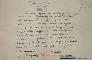 Colette demande un délai pour adresser ses chroniques, et demande à collaborer par la suite autrement que par sa critique théâtrale. « ... Venez vite. Mangeons la rascasse farcie, la daube de bœuf, les ravioli, la sardine grillée... » Joint, 9 pièces. Soit : une carte autographe signée d'Henry Gauthier-Villars, dit Willy, premier mari de Colette, (s.d., avec coupure de presse collée, au verso d'un portrait photographique de Polaire). Message humoristique reformulant avec jeu de mots un texte paru dans un périodique, « Garde toi, tant que tu vivras, / de jucher les champs sur la mine ». Ce jeu de mots serait repris par Colette dans « Noces », évoquant sa vie avec Willy, publié dans le recueil Gigi en 1944. — 2 pièces dactylographiées internes à la rédaction du Journal, concernant les difficultés qui ont conduit à la fin de la collaboration de Colette avec le quotidien (1938). — Copie dactylographiée d'une lettre du journaliste Jacques de Marsillac, ancien rédacteur en chef du quotidien Le Journal, au secrétaire général de la Comédie Française Jean Nepveu-Degas concernant un article de Colette du quotidien Le Journal cité dans le spectacle d'Édouard Bourdet Les Temps difficiles créé en décembre 1948. — Lettre signée de Jean Nepveu-Degas en réponse à celle ci-dessus (1949). — Prospectus publicitaire imprimé pour la « crème aliment » que Colette commercialisait dans son magasin de produits de beauté (probablement 1932). — Document du percepteur de Colette concernant le paiement de sommes qu'elle devait et qui étaient entre les mains de Bernard Grasset (1934). — Lettre autographe signée de Maurice Goudeket, le dernier mari de Colette, évoquant celle-ci (s.d.) — Exemplaire du faire-part de décès de Colette (1954).