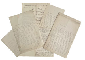 Manuscrit autographe signé dans le corps du texte intitulée « La Reine chérie ». [1852]. Notice publicitaire pour son roman La Forêt noire (Paris, P. Permain), réédité en 1857 sous le titre La Reine des épées (Paris, Librairie nouvelle). Joint, d'une autre main, la même note modifiée par l'éditeur dans un sens outrageusement laudateur. — 2 lettres autographes signées à l'écrivain, critique et directeur de revue Édouard Fournier. 1863 et 1864. Lettres très spirituelles, l'une annonçant la naissance d'une fille, et l'autre évoquant plusieurs de ses œuvres en collaborations des dernières années, notamment Jean-qui-rit, Jean Diable, Les Compagnons du silence, Le Capitaine fantôme, Les Habits noirs, Les Couteaux d'or, Bouche de fer, Le Roi des gueux, Le Loup blanc. Il conclut  « Est-ce tout ? On prétend que non. Je suppose, en tout cas, que personne n'a mieux mérité que moi le droit de mal étreindre pour avoir trop embrassé... Si vous trouvez la lettre ci-dessus par trop nigaude, il est bien entendu qu'elle ne redoute pas le sommeil du panier... » — Lettre autographe signée en qualité de président du comité de la Société des gens de lettres, à un auteur d'ouvrages de vulgarisation scientifique. 1865. Il sollicite sa collaboration aux conférences organisées salle Valentino rue Saint-Honoré sous l'égide du ministère de l'Instruction publique. Il le fait sur un ton badin qu'il excuse ainsi : « La sympathie même ignorée donne quelques droits ». — Lettre autographe signée à un éditeur ou à un directeur de presse. S.d. « Je me suis mis en rut [avec marque de prononciation allemande sur le « u » indiquant la lecture « route »] en vous quittant avec d'autant plus de rage que j'étais plus contrarié de refuser vos bienveillantes propositions. Voulez-vous m'accorder une minute ? J'ai trouvé un sujet à triple carillon. Je vous l'expliquerai horriblement mal parce que c'est une faculté qui me manque, mais vous comprendrez et nous traiterons, si c'est toujours votre désir. J'avoue que j'aurai du plaisir à écrire cette histoire qui est brillante et curieuse : plus de plaisir encore si je puis conquérir chez vous ce succès que vous souhaitez... » — Lettre autographe signée. [Probablement 1863]. Concernant son livre Le Poisson d'or. « Amélie. – Mais puisque c'est une blague. Pochet. – Je sais bien, mais tout de même ! (Il se mouche bruyamment, puis) Ah ! le mariage est une belle institution ! » (p. 132).