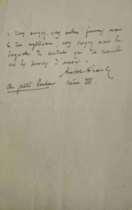 Au Petit bonheur : manuscrit autographe. 2 ff. in-4. Dialogue entre Cécile et Germaine sur les fleurs, fragment de sa pièce Au Petit bonheur parue en 1898. — Au Petit bonheur  : citation autographe signée. 1 f. in-12. Passage concernant les femmes extrait de cette pièce. — Dieux ont soif (Les) : manuscrit autographe. 11 ff. in-folio. Passages du chapitre VII de ce roman paru en 1912. — Jeanne d'Arc : notes bibliographiques autographes. 1 f. in-8. Anatole France publia une Vie de Jeanne d'Arc en 1908. — [Laffitte (Pierre )] : manuscrit autographe signé. 3 ff. in-folio. Brouillon d'une lettre au maire de Béguey (en Gironde) concernant le philosophe Pierre Laffitte (disciple d'Auguste Comte), avec qui Anatole France conversa parfois quand il séjournait chez madame Arman de Caillavet. Il s'agit probablement ici d'un texte à lire lors de la fête annuelle de Béguey. — Prud'hon, Lagrenée et Gagneraux : notes de lecture autographes sur ces trois peintres. 3 ff. in-4 et in-8. Anatole France publia en 1923 une vie de Prud'hon dans le catalogue de Charles Martine 70 dessins de Pierre-Paul Prud'hon. Gagnereaux et Lagrenée furent des contemporains de Prud'hon. — [Rais (Gilles de)] : manuscrit autographe. 3 pp. in-4. Anatole France a consacré a Gilles de Rais une plaquette ainsi qu'un livre (Les Sept femmes de Barbe Bleue), et y est revenu dans le cadre de son travail sur Jeanne d'Arc. — Révolte des anges (La) : manuscrit autographe. 1 p. in-folio. Passage du chapitre XIV de ce roman paru en 1914. — « Salut, généreuse Argentine... » : propos autographe signé. 1917. 1 p. in-12 oblong. « Salut, noble sœur latine, à qui la liberté est plus chère que la vie, salut généreuse Argentine... » « La Vie littéraire » : pièces relatives à ses chroniques « La Vie littéraire » dans le journal Le Temps. Soit : J.-H. Rosny : notes autographes concernant cet écrivain. 3 ff. in-8 carré. — Roswitha : notes autographes concernant cette dramaturge et poétesse de l'époque carolingienne. 2 ff. in-8 carré. — Jules Tellier : article imprimé avec corrections et ajouts autographes, intitulé « Jules Tellier, 1863-1889 ». 1 colonne montée sur feuillet in-folio. Chronique concernant cet écrivain, intégrée en 1892 dans la quatrième série de son recueil La Vie littéraire. — J.-J. Weiss : notes autographes. 2 ff. in-4. Références bibliographiques sur cet écrivain et homme politique. Joint, l'article imprimé avec ajouts autographes, intitulé « J.-J. Weiss » (6 colonnes montées sur 3 ff. in-folio). Cette chronique serait intégrée en 1892 dans la quatrième série de son recueil La Vie littéraire.