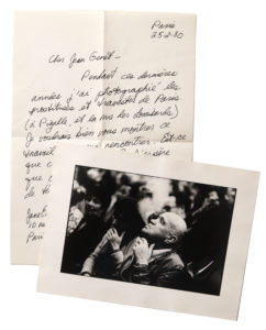 Portrait de Jean Genet, assistant à la conférence donnée par Angela Davis à la Mutualité le 5 mai 1977. L'activiste américaine demandait la libération des « 10 de Wilmington », dix personnes noires dont le pasteur Ben Chavis, condamnés à des peines de prison à la suite d'une erreur judiciaire sur fond de faux témoignages à relents racistes. Avec la lettre autographe signée de l'artiste à Jean Genet accompagnant l'envoi de cette photographie. Paris, 25 février 1980. « Pendant ces dernières années j'ai photographié les prostituées et travestis de Paris (à Pigalle, et la rue des Lombards). Je voudrais bien vous montrer ce travail et vous rencontrer. Est-ce possible ? J'espère que oui... P.S. En tout cas, voilà une petite photo pour vous, prise il y a quatre (?) ans quand Angela Davis est venue à Paris pour le Wilmington 10. »