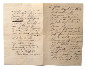 Alechinsky (Pierre). Lithographie originale. Carton d'invitation au vernissage de son exposition Encres sur cartes de navigation & peintures de l'année qui se tint le 7 octobre 1981 à la galerie Maeght. — Atlan (Jean-Michel). Carte autographe signée à Hermine Chastanet. 1957. Joint, son faire-part de décès. — Biard (François-Auguste). 3 lettres autographes signées : concernant l'envoi de 4 tableaux à une exposition à La Haye (1847), à un « cher docteur » pour prendre rendez-vous au sujet d'une crainte (s.d.), et concernant la fixation du prix d'une de ses œuvres (s.d.). — Bofa (Gustave Blanchot dit Gus). S.d. Carte autographe signée à un critique pour le remercier d'un article favorable sur le Salon de l'Araignée qu'il dirigeait. — Bourdelle (Émile-Antoine). Carte de visite autographe signée à l'éditeur François Sant'Andrea. S.d. « Émile-Antoine Bourdelle prie son ami St-Andrea de bien vouloir faire tenir et prêter à titre gratuit à monsieur Monod du Musée du Luxembourg des photos de mes sculptures. Elles illustreront de très belles, très solides et éloquentes études sur mes travaux... » — Charlet (Nicolas-Toussaint). 4 lettres autographes signées au peintre Denis-Auguste-Marie Raffet. Sur un dessin fait pour l'éditeur Charles Furne (15 décembre 1845), « je reste à ma chambre comme un vieux melon sous cloche... » (24 décembre 1844). — Chéret (Jules). Lettre autographe signée [au poète Catulle Mendès]. 1890. « Mille fois merci et bien des compliments pour le livre que vous avez eu l'amabilité de m'adresser avec une dédicace que je conserverai à la bonne place. Mon exposition est terminée et je vous rends enfin le croquis que vous avez bien voulu me prêter. Comme j'en ai reçu bien des compliments (excusez mon peu de modestie), je suis heureux de savoir chez vous ce que je considère comme de mes meilleurs dessins... » — Constant (Benjamin). Lettre autographe signée. Londres, « ce 20 nov. ». Le peintre orientaliste annonce qu'il va écrire « au maire de Carcassonne pour l'autorisation nécessaire ». — Corabœuf (Jean). Portrait photographique, signé et daté 1902 au recto sur le support. — Dauzats (Adrien). Lettre autographe signée au peintre Denis-Auguste-Marie Raffet. 1853. « Voulez-vous avoir l'obligeance de présenter mes excuses à Son Altesse le prince Anatole de Demidoff, pour le retard, bien involontaire, que je mettrai à envoyer le tableau que j'ai promis... » — Decamps (Alexandre-Gabriel). 6 lettres autographes signées. Soit une lettre au peintre Denis-Auguste-Marie Raffet, pour l'inviter à dîner avec Royer à Châtillon, où il lui remettra « la toile du tableau convenu » (1847) ; 5 lettres au marchand de tableaux et de fournitures d'arts parisien Jacob Tedesco, relatives entre autres à un tableau qu'il peint pour son correspondant, à un encadrement à faire faire, à des fournitures de couleurs nécessaires (1851-1858 et s.d.). — Denis (Maurice). 2 lettres autographes signées, soit : « ... J'aimerais que vous me fissiez l'honneur de venir voir mon exposition au pavillon de Marsan, – une exposition générale, trente-cinq ans de peinture !... » (« 8 avril » ) ; et « ... Des deux décorations dont je vous devrais une égale reconnaissance, c'est tout de même celle du plafond qui me fera le plus de plaisir, n'en doutez pas, et qu'elle soit en bonne voie maintenant, grâce à vous, c'est la meilleure nouvelle que vous me puissiez donner... » (« 8 avril », également). — Dufy (Raoul). Lettre autographe signée à Fernand Fleuret. Paris, 1912. Belle lettre concernant leur travail en commun pour l'ouvrage Friperies. — [Etex (Antoine)]. 2 lettres et une pièce adressées à ce peintre et sculpteur, soit : Amilhau (Pierre Catherine), lettre autographe signée du député en qualité de premier président de la Cour de Pau, au sujet des bas-reliefs du socle de la statue que cette ville, soutenue par Louis XVIII, fit élever en l'honneur d'Henri IV (1836) ; Rouxin (Charles), lettre autographe signée en qualité de maire de Saint-Malo, au sujet du projet de statue que cette ville comptait élever en l'honneur de Chateaubriand (1864) ; Parisis (Pierre-Louis). Pièce signée en qualité d'évêque de Langres, programme artistique détaillé de sa commande d'une sculpture en marbre représentant la Flagellation du Christ (s.d.). — Folmer (Georges). Une lettre et une carte, autographes signées à une amie, dont : « ... La vie à Paris devient de plus en plus trépidante... car le mot gagne la peinture... qui s'en passerait bien : vraiment l'époque n'est pas particulièrement propice aux épanouissements de quelques genres auxquels ils appartiennent. Mais la lutte est encore belle. Il ne reste même plus que cela : la lutte... » (1962). — Folon (Jean-Michel). 2 cartes autographes signées à Renée Legrand : « ... Eh bien dis donc, quelle famille, tout le monde plane, tout le monde s'évade, quelle ambiance... » (1981 ) ; « Je suis heureux de savoir que tu t'envoles à nouveau, et d'avoir de tes nouvelles, et de lire ton optimisme retrouvé... » (1981). — Garnier (Charles). 2 lettres autographes signées, l'une pour obtenir une loge (années 1870), l'autre pour recommander « un pauvre garçon dans la plus grande misère » qui cherche une maison où se loger dans les environs de Paris (années 1870 également). — Gillet (Louis). Lettre autographe signée à un « cher confrère ». 1935. Concernant une expositions sur l'Académie française. — Lartigue (Jacques-Henri). 3 lettres. Soit : une lettre autographe signée en deux endroits et une lettre autographe adressées à Albert Willemetz pour demander une intervention en faveur de son cousin l'écrivain et réalisateur André Haguet, évoquer l'envoi d'un manuscrit et parler de son travail, « Je commençais à "travailler" si bien que je peux, je crois, espérer encore que ma trajectoire ne sera pas trop brisée... ?...