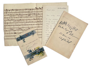 — Hahn (Reynaldo). 6 lettres et une carte autographes signées. Soit : il décline une invitation à participer au banquet de La Phalange (s.d.), parle de répétitions avec Camille Saint-Saëns (s.d.), accepte de mettre en musique une poésie de son correspondant (s.d.), traite de ses collaborations avec l'écrivain Maurice Donnay (1926-1935). — Ibert (Jacques). Lettre autographe [à Albert Willemetz]. Versailles, 22 juillet 1953. Billet amical. — Indy (Vincent d'). 2 lettres autographes signées, l'une adressée à un critique du journal bruxellois La Réforme et comprenant une notice autobiographique autographe (1896), l'autre concernant une audition à la Schola cantorum (« 30 mai »).