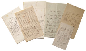 À Juliette Récamier (4 lettresn, 1842-1844) : Londres, 4 juillet 1842. Lettre accompagnant l'envoi d'un ananas qu'elle-même a reçu de la marquise de Lansdowne, Louisa Fox-Strangways. La tragédienne s'excuse de la brièveté de sa lettre : « ... Oserois-je m'en dédommager en réclamant une seconde fois cette bienveillance que j'ai toujours reçue à l'abbaye-au-Bois... » (1. p. 1/2 in-8). — Paris, 30 décembre 1842. « ... Vous savez, n'est-ce pas, tout le plaisir que j'ai à me retrouver près de vous, toujours si bonne, si bienveillante pour moi.... » (1 p. in-12, enveloppe conservée).— Paris, 14 mars 1843. « J'ai appris hier avec chagrin à votre porte que vous étiez souffrante. Soyez assez bonne pour faire dire à mon domestique comment vous êtes aujourd'hui. Si je ne jouais pas Phèdre ce soir, j'aurais été moi-même savoir de vos nouvelles, peut-être m'auriez-vous reçue, ce qui m'aurait fait un bien grand plaisir... » — Paris, « le 19 mars » [1844]. « Je suis bien coupable envers vous ; voilà des siècles que j'ai eu le bonheur de vous voir et cependant vous avez pris la peine de passer à ma porte... Depuis quelques semaines, je suis absorbée par les répétitions de Catherine [la pièce Catherine II d'Hippolyte Romand, qui serait créée le mois suivant à la Comédie-Française] ; ma santé aussi m'a jeté[e] dans un découragement qui m'a empêchée de rien faire ; j'espère pouvoir aller vous rendre une petite visite jeudi prochain et vous redire de vive voix tous les sentiments de respect et d'attachement que je vous porte... » (1 p. in-8). Les autres lettres, à divers correspondants, évoquent l'opéra le Val d'Andorre de Fromental Halévy, Eschyle, Sophocle, etc.