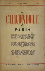 On joint: le n°6 d'avril 1944 de La Chronique de Paris, contenant une étude de Karl Epting (directeur de l’Institut allemand à Paris), intitulée Louis-Ferdinand Céline, consacrée à l’œuvre de Céline, depuis Semmelweis aux textes maudits, et un article de Georges Blond au sujet de Guignol’s band qui venait de paraître.