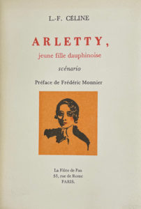 Edition originale de ce scénario de film, composé en 1948 : texte d’hommage, Céline aurait ainsi voulu réaliser un film sur Arletty (1898-1992). Ornée en frontispice d’un portrait d’Arletty, tiré d’une affiche en couleurs de Van Dongen, l’édition débute avec une préface de Frédéric Monnier, fils de Pierre Monnier, à qui Arletty avait confié une copie dans les années 50.