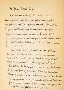 L’auteur a composé 4 jolies stances sur le chiffre cinq (numéro de cet exemplaire). Le volume est accompagné de 2 cartes de visite de Claude Bonnefoy adressées sans doute à un éditeur pour recommander les poèmes de son ami Jean-Pierre Colas, d’une carte postale en noir et blanc (Republica populara romana ; fleuve et église parmi des arbres), postée de Bucarest 29 sept. 1963, adressée par C. Bonnefoy à J.-P. Colas.
