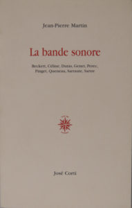 MARTIN (Jean-Pierre). La Bande sonore : Beckett, Céline, Duras, Genet, Perec, Pinget, Queneau, Sarraute, Sartre. Paris, José Corti, 1998. In-8, broché. Étude de la voix en littérature, le parlé-écrit et l’écrit-parlé : la sonorité de l’écriture, sa perception par le lecteur et l’auditeur. Essayiste et auteur de fictions, Jean-Pierre Martin (né en 1948), est maître de conférences en littérature française.
