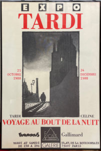 Exposition Tardi. Futuropolis-Gallimard, 1988. 40 x 60 cm, sur le papier couché mat identique à celui utilisé pour la reliure cartonnée de premier tirage (celloderme 32 gr.), sous verre dans un encadrement aluminium, laqué noir. Affiche éditée lors la parution de Voyage au bout de la nuit chez Futuropolis, pour l’exposition des planches de l’artiste à l’Espace Paris-Galerie (oct.-déc. 1988). Le grand dessin central en noir et blanc (23 x 34,5 cm) reprend l’illustration de la couverture du premier tirage de 1988 : Bardamu de dos marchant voûté dans la banlieue.
