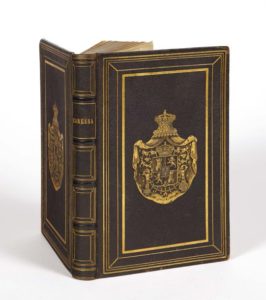 Un des trois exemplaires connus de l'édition originale de Caressa reliés de manière strictement identique, aux mêmes armes. Est-ce par passion pour cette histoire d'amours mal assorties que l'époux malheureux de la reine d'Espagne a ainsi commandé trois reliures identiques ou était-ce pour adresser un message aux amis - mieux encore, aux amants - à qui il offrait un exemplaire ?