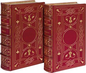 Chef-d'œuvre de l'imprimeur lyonnais Louis Perrin, cette somptueuse édition de Marot, entièrement réglée à la presse d'un filet rouge, est ornée d'un portrait du poète en frontispice, de la marque de l'imprimeur in fine, et d'ornements gravés reproduisant ceux de l'édition de 1544 : un encadrement architectural sur les titres des volumes, des bordures signées J. M. Fugère sur ceux de chaque partie et de jolies initiales décorées. Un des 100 exemplaires sur Whatman vergé. Très bel exemplaire dans une somptueuse reliure d'Isidore Smeers au décor inspiré des chefs-d'œuvre de la Renaissance. Ex-libris aux initiales G. P. gravé par Guezennec. Traces d'un ex-libris arraché sur un feuillet du relieur. Menus frottements sur les étuis. Vicaire, V, 540-541.