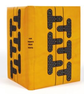 In-4 monté sur onglets : veau glacé jaune vif, dos lisse, deux incisions verticales au centre des plats, six pièces de maroquin noir à motif tressé mosaïquées en relief, doublures et gardes de daim bleu-vert, non rogné, couverture et dos conservés, chemise, étui (Georges Leroux, 1973).