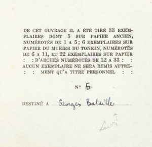 Un des 5 exemplaires de tête sur papier ancien, vergé bleuté du XVIIIe siècle, celui-ci nº 5 pour Georges Bataille lui-même.