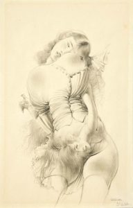 Superbe dessin original signé de Hans Bellmer figurant deux femmes dont les corps se mêlent, variation sur le thème de la poupée.