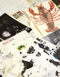 - Scénario. 8 septembre 1964. Reproduction de dactylogramme de 20 pages agrafées, retravaillée par le scénariste. Avec deux dessin originaux, portrait à l'écrevisse, l'un au stylo bille, l'autre à l'encre de Chine et à l'aquarelle et une introduction d'une page 1/3 (double carbone). 2 papillons de brouillons.