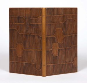 In-8 étroit : veau lavallière, dos lisse, plats ornés d'un décor pyrogravé, non rogné, tête noire, couverture et dos conservés, étui (Monique Mathieu).