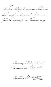 Traduction italienne, par E. B. Schubart, de cette relation du siège de Copenhague de 1807. Le Danemark, s'étant joint dès 1800 à la Ligue des neutres, fut contraint d'entrer dans le Système continental par Napoléon et Alexandre Ier. Les Anglais bombardèrent le Danemark qui capitula à Copenhague le 7 septembre 1807 et leur livra sa flotte. Très bel exemplaire offert à Elisa Bonaparte, avec envoi autographe signé du traducteur : À son Altesse impériale Madame la Princesse de Lucques et de Piombino, grande duchesse de Toscane etc. Hommage d'admiration et de respect du traducteur. Baron de Schubartz. Elisa Bonaparte, sœur de Napoléon et protectrice des lettres, sera nommée grande-duchesse de Toscane en cette même année 1809.