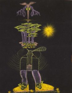 Dessin aux crayons de couleur et pastel sur papier vergé noir avec noms des participants au verso de la main d'André Breton (310 x 237 mm) : sous verre.