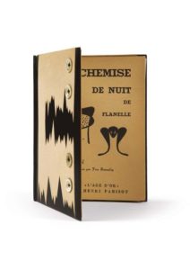 In-16 : veau noir, dos lisse, plats recouverts de daim beige avec, sur le premier plat, incrustation de quatre boutons nacrés, non rogné, tête dorée, couverture illustrée conservée (Leroux, 1958).