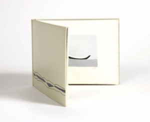 In-16 oblong : veau mastic, dos lisse, sur les plats décor mosaïqué de box gris foncé et deux filets noirs, doublures de veau mastic, gardes de daim noir, non rogné, couverture conservée, chemise, étui (Leroux, 1990).