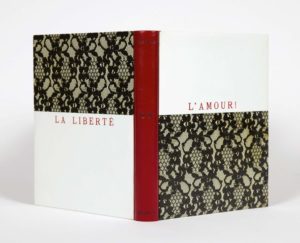 In-12 : demi-veau rouge, plats de vélin blanc recouverts sur la moitié d'une dentelle noire avec titre imprimé en lettres rouges, doublures de daim rouge, entièrement non rogné, couverture et dos conservés, chemise, étui (Antonio).