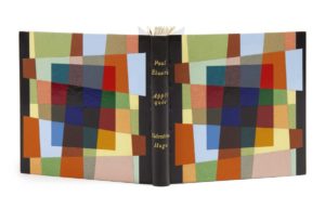 In-16 carré : demi-veau noir à bandes, dos lisse, plats recouverts d'un décor géométrique multicolore de papiers mats et brillants, gardes de papier brillant noir, non rogné, tête dorée, couverture et dos conservés, chemise, étui (Pierre-Lucien