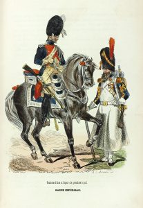 Édition originale et premier tirage de la belle illustration de Bellangé, E. Lamy, de Moraine et Ch. Vernier, composée de 50 figures hors texte, dont 43 planches gravées sur bois et 7 vues sur acier, et de très nombreuses vignettes sur bois dans le texte. Cette belle iconographie comporte 39 belles planches coloriées à l'époque d'uniformes. Superbe exemplaire dans une agréable et fraîche reliure romantique très décorative. Il est bien complet des pages de musique notée de marches et fanfares qui manquent souvent, ainsi que des feuillets de table et de placement des figures. Des bibliothèques Abel Giraudeau et Jules Le Roy, avec ex-libris manuscrit et gravé.