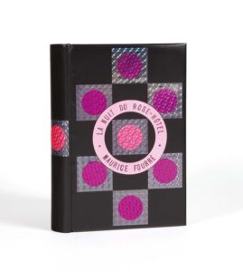 In-12 : veau noir, dos lisse orné, plats décorés de sept cadres mosaïqués de plastique transparent kaléidoscopique avec, au centre de chacun, un rond de plastique de même nature mais rose ; au centre du plat supérieur, grand cercle de veau rose sur lequel est inscrit le nom de l'auteur et le titre en lettres noires, doublures et gardes de daim rose, non rogné, tête dorée, couverture illustrée et dos conservés, chemise, étui (Leroux, 1991).