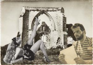 Carte postale figurant au verso l'abbaye des Chateliers à La Flotte-en-Ré, vue ornée d'un collage original.
