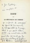 Long envoi autographe signé : à Jean Petithory, mon exemplaire de isou ou la mécanique des femmes qui, en principe, est accompagné des «épreuves» et d'un manuscrit, des textes inédits de l'ouvrage, destinés à une seconde édition arrêtée, au moment même où elle devait être commencée, par les «forces obscurantistes» - ou les poulets - de la Mondaine