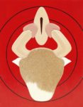 In-12 : veau rouge, dos lisse, plat supérieur orné d'une composition, fi gurant une tête de taureau dont les cornes sont formées de pénis se rejoignant dans une vulve mosaïquée de box mastic, beige, rose et rouge, la tête en peau de vache en deux tons, doublures et gardes de daim noir, entièrement non rogné, couverture et dos conservés, chemise, étui (Leroux, 1987).