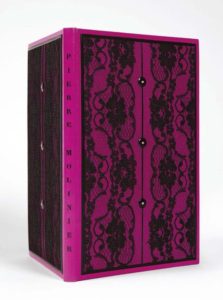 In-8 : box rose, dos lisse, plats recouverts de dentelle noire contenue dans un cadre mosaïqué de box noir avec un listel de box noir vertical au centre et trois boutons noirs avec fil rose, encadrement intérieur de box rose, doublures et gardes de soie noire, non rogné, tête dorée, couverture illustrée et dos conservés, chemise, étui (Georges Leroux, 1969).