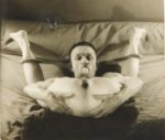 Fameux autoportrait, les jambes écartées, avec une balle de bouche : photographie originale, tirage argentique (55 x 64 mm ; une tache).