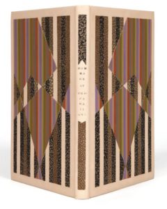 In-8 : box couleur chair, dos lisse orné de deux pièces mosaïquées de maroquin et de galuchat, grand décor géométrique mosaïqué sur les plats de bandes de maroquin, de galuchat et de box de sept couleurs différentes, doublures et gardes de daim brun, entièrement non rogné, couverture et dos conservés, chemise, étui (Leroux, 1980).