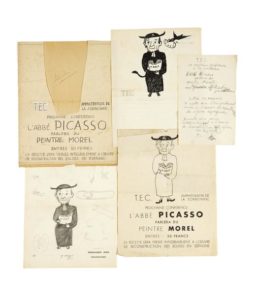 L'affichette a été éditée à l'occasion de l'hommage consacré à Picasso par l'abbé Morel, les 1er février et 15 mars 1946. La conférence fut accompagnée de projections par Paul Haesaerts ainsi que d'une lecture de Paul Eluard.
