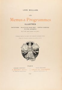 1898. LIVRE : (ART). LES MENUS & PROGRAMMES ILLUSTRÉS. Invitations, billets de faire part, cartes d'adresse, petits estampes du XVII siècle jusqu'à nos jours. Paris : Libr. G. Boudet et Ch. Tallandier, 1898. Folio mineur. VIII + 402 p. + 1 h. + 16 planches (sur un total de 19). Profus. illustré de dessins hors texte et dans le texte, dont certains chromolithographiés par des artistes importants tels que Toulouse-Lautrec, Mucha, Robida, Steinlen, etc. 3 feuilles détachées. Enc. en demi-toile et pointes signées, tejuelo, pointes et dos légèrement frottés. Tirage de 1 050 exemplaires. CCPB 483030-X. Traduit automatiquement par DeepL. Seule la version originale fait foi.