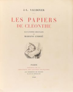 1928. LIVRE : (BIBLIOPHILIE). VAUDOYER, J. L. ; ANDREÙ MARIANO (ill.) : LES PAPIERS DE CLÉONTHE. Paris : Éditions de la Chronique des lettres françaises, 1928. 4º plus grand. 247 p. + 2 h. Illustré par des gravures de Mariano Andreù dans le texte. Édition numérotée de 300 exemplaires. Cet exemplaire comporte également une gravure originale signée au crayon par l'artiste. Livre de poche, avec quelques taches de rouille. Traduit automatiquement par DeepL. Seule la version originale fait foi.