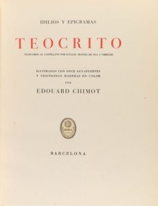 1943. LIVRE : (BIBLIOPHILIE). IDYLLES ET ÉPIGRAMMES DE THÉOCRITE. Traduit en espagnol par IGNACIO MONTES. Barcelone : Montaner y Simon, 1943. Folio mineur. 121 p. Illustré de buis dans le texte et de 11 planches avec des aquarelles d'EDOUARD CHIMOT. Édition numérotée de 250 exemplaires sur papier fil. Enc. en plein cuir, fers dorés sur les deux plans, roues et bords, nerfs, double tejuelo, garniture supérieure dorée, gardes en soie. Traduit automatiquement par DeepL. Seule la version originale fait foi.