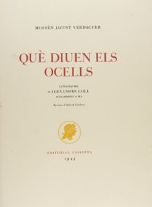 1945. LIVRE : (BIBLIOPHILIE). VERDAGUER, JACINT : QUÈ DIUEN ELS OCELLS. Lithographies d'Alexandre Coll coloriées à la main. Révisé par Alfred Gallart. Barcelone : Editorial Casiopea, 1945. Folio. III + 162 p. + 2 h. + 16 lithographies en couleurs, vignettes à une encre. Édition numérotée limitée à 360 exemplaires. Singulier recueil de poèmes et de prose dédiés aux oiseaux, avec lesquels le poète interprète les paroles de leurs chants. Splendide édition, publiée à l'occasion du centenaire du grand écrivain, avec de belles lithographies en couleurs, de belles vignettes à une encre, et du texte à deux encres. Prologue d'Antonio Julià de Capmany. Reliure brochée originale et pochette de l'éditeur. Traduit automatiquement par DeepL. Seule la version originale fait foi.