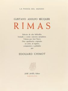 1946. LIVRE : (BIBLIOPHILIE). BECQUER, GUSTAVO A. ; CHIMOT [illustré] : RIMAS. Vignettes de Jose Narro. Dix gravures originales en couleur, en registre, composées et gravées par Edouard CHIMOT. Barcelone : Jose Janes edit., 1946. Folio mineur. 152 p., 2 h. Légères taches de rouille. En branche, présenté dans une housse et un flacon de papier imperméable. Exemplaire numéroté des 80 imprimés sur papier Royal Annam avec l'état définitif des planches, sur un total de 140 exemplaires. Palau 26349. Traduit automatiquement par DeepL. Seule la version originale fait foi.