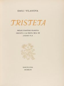 1947. LIVRE : (BIBLIOPHILIE). VILANOVA, EMILI ; PLA, JAUME [illustrateur] : TRISTETA. Prologue d'Antonio Vilanova. Barcelone : Societat Aliança d'Arts Gràfiques, 1947. 4º mineur. 143 p. 14 gravures à la pointe sèche de Jaume Pla. Edition de 150 exemplaires numérotés sur papier fil. En branche, présenté dans un étui en demi toile et pointes, cartoné papier imperméable. Traduit automatiquement par DeepL. Seule la version originale fait foi.
