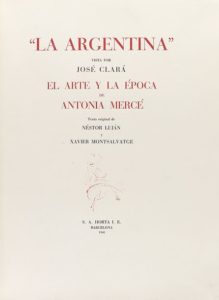 1948. LIVRE : (BIBLIOPHILIE). LUJAN, NESTOR ; MONSALVATGE, XAVIER : "L'ARGENTINA" VUE PAR JOSE CLARA. L'art et l'époque d'Antonia Mercé. Texte original par... Barcelone : S.A. Horta I. E., 1948. Folio mineur. 131 p., 1 feuille. Profondément illustré de dessins en couleur, dans le texte. En branche, couverture et pochette. Édition numérotée de 150 exemplaires sur papier filigrane avec une série complète d'iustrations en couleurs, sur un total de 250. Cet exemplaire comporte également une "page d'échantillons" (marquée comme telle). Traduit automatiquement par DeepL. Seule la version originale fait foi.