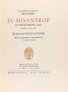 1951. LIVRE : (BIBLIOPHILIE). MOLIERE, JEAN-BAPTISTE POQUELIN : LE MISANTHROPE. Traduction par Joan Oliver. Barcelone : Aymà Editor, 1951. 4º mineur. 155 p. Illustré de 6 gravures à l'eau-forte par J. Granyer. Enc. en toile, tejuelo. Copie de l'édition numérotée et limitée à 116 exemplaires des 8 collaborateurs, imprimée sur papier fil de la Casa Guarro. Traduit automatiquement par DeepL. Seule la version originale fait foi.